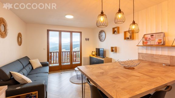 - Un balcon de 6m² avec table chaises parasol et deux transats avec vue sur le lac de Matemale et le village des Angles