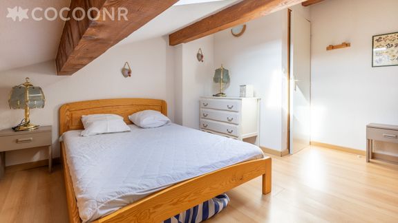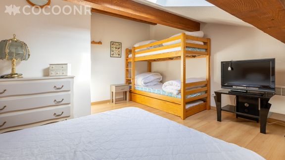 - Chambre 2 avec un lit double (140×190), un lit superposé + lit simple en-dessous (lit gigogne)