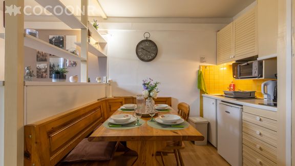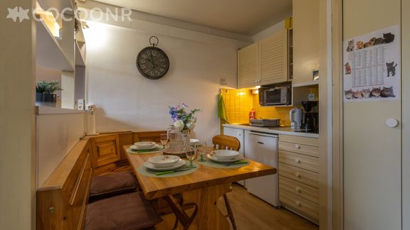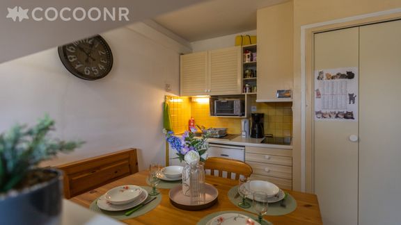 - Une cuisine ouverte équipée avec notamment : bouilloire électrique, four, four à micro-ondes, grille-pain, plaques de cuisson, cafetière à dosettes, ...