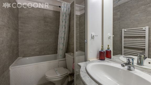 - Une salle de bain avec baignoire, sèche serviettes et WC.