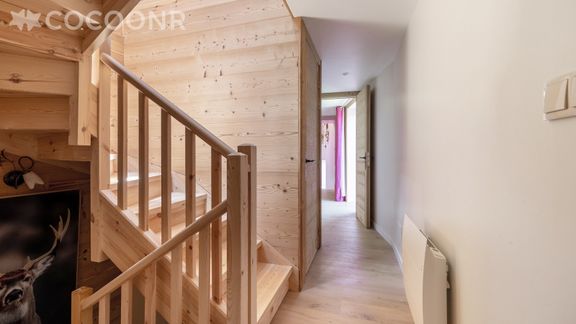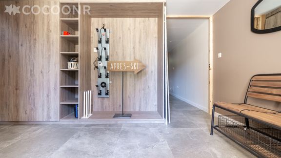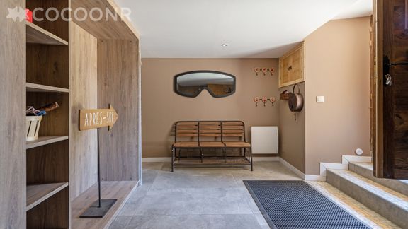 - Un grand vestiaire aménagé avec un banc, un sèche-chaussures de ski mural, des étagères et des portes-manteaux.