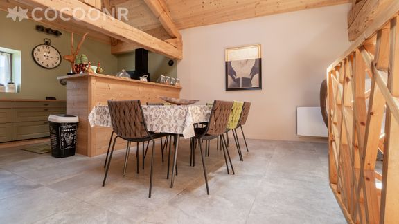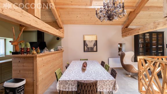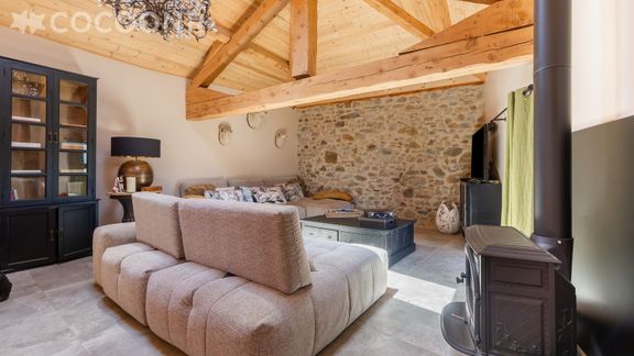 - Une belle pièce de vie avec poutres apparentes avec un coin salon doté de deux canapés et de fauteuils, une table basse, une TV, un poêle à bois fonctionnel ainsi qu'un espace repas avec une table à manger pouvant accueillir jusqu'à 10 convives.