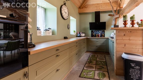 - Une cuisine ouverte sur la pièce de vie, entièrement équipée : réfrigérateur, lave-vaisselle, congélateur, four, plaques à induction, micro-ondes, grille-pain, bouilloire, cafetière à dosette Nespresso.
