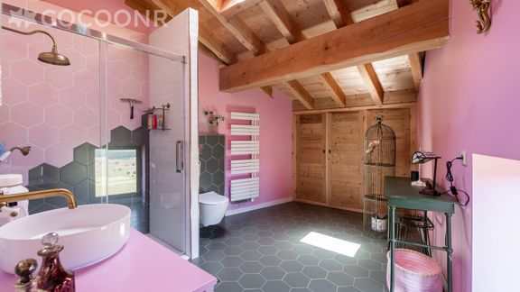 - Chambre 1 : un lit double et une salle d'eau attenante, ouverte sur la chambre avec une douche à l'Italienne, une vasque et des rangements. WC