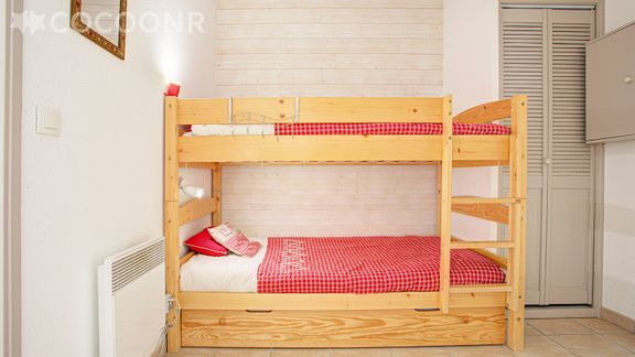 - L'entrée se compose d'un coin cabine avec un lit superposé (possibilité de fermer avec un rideau)