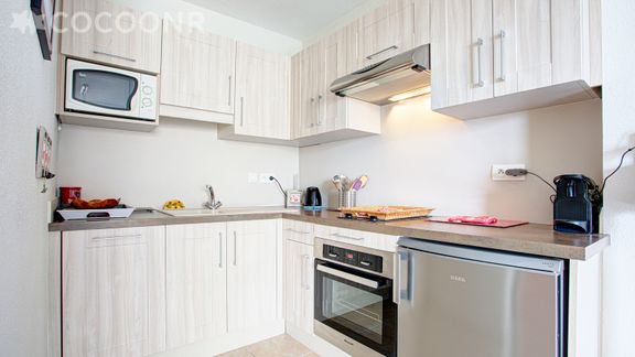 - Une cuisine équipée avec notamment : bouilloire électrique, four, four à micro-ondes, grille-pain, plaques de cuisson...