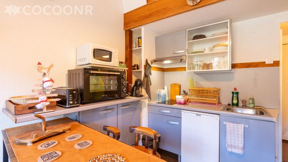 - Une kitchenette ouverte équipée avec notamment : bouilloire électrique, four, four à micro-ondes, grille-pain, plaques de cuisson, machine à café Dolce Gusto, cafetière à filtre...