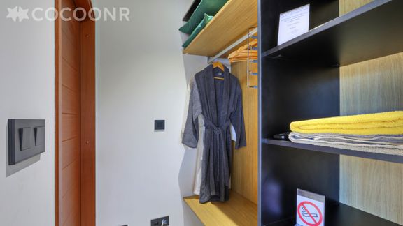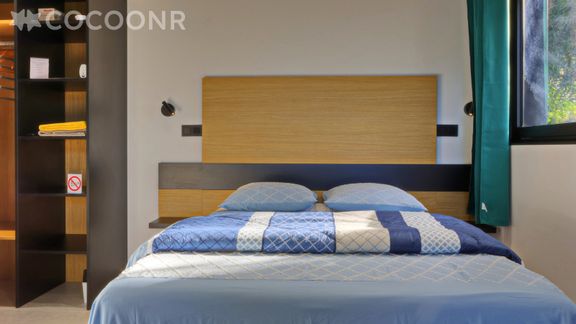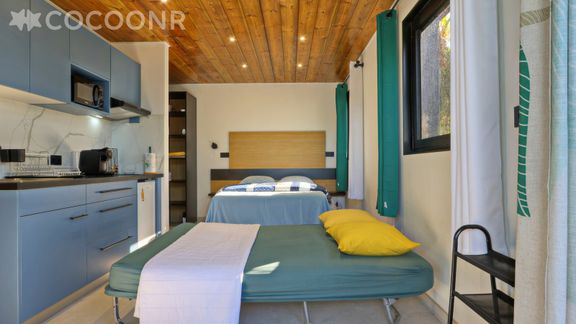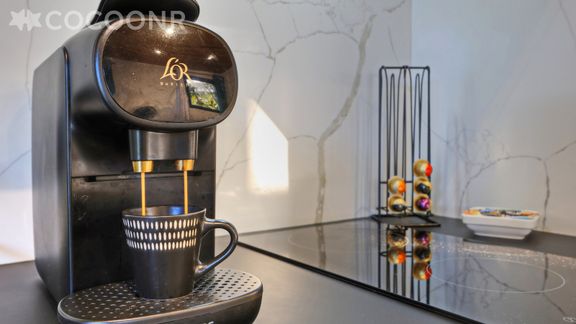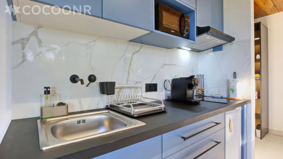 - Une pièce de vie de 22 m² avec cuisine ouverte équipée avec notamment : bouilloire électrique, four à micro-ondes, grille-pain, plaques de cuisson...