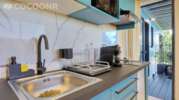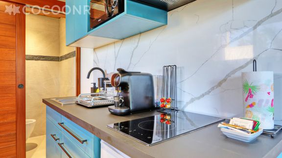 - Une pièce de vie de 15 m² avec cuisine ouverte équipée avec notamment : bouilloire électrique, four à micro-ondes, grille-pain, plaques de cuisson...