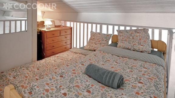 - Une mezzanine ouverte avec 1 lit double (140×190) et 1 lit gigogne (2 lits simples 90x190)