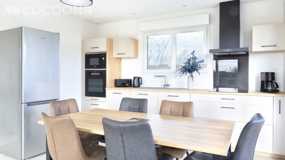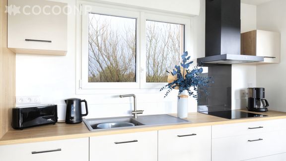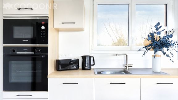 - Une cuisine équipée avec notamment : bouilloire électrique, four, four à micro-ondes, grille-pain, lave-vaisselle, plaques de cuisson...