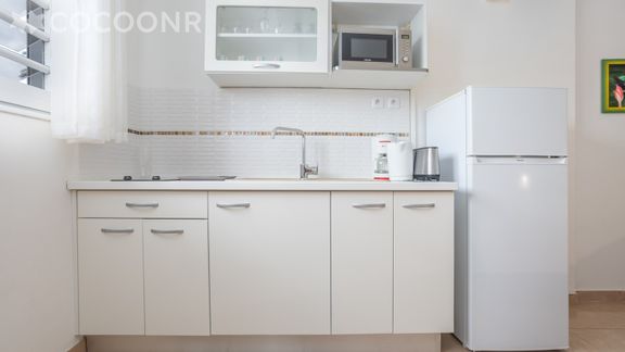 - Une cuisine ouverte équipée avec notamment : bouilloire électrique, four à micro-ondes, grille-pain, plaques de cuisson...