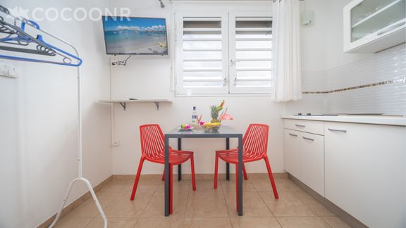 - Une pièce de vie de 19 m² avec un lit double (140×190), TV, coin repas