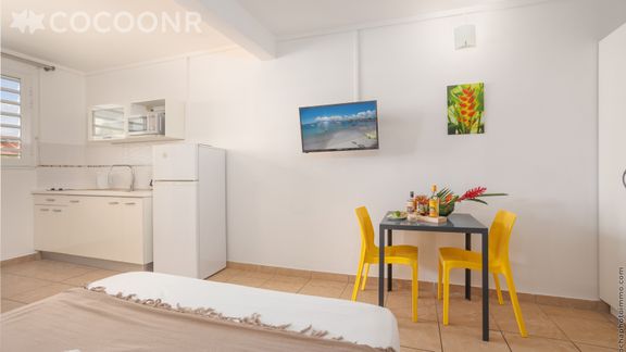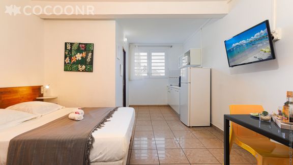 - Une pièce de vie de 19 m² avec un lit double (140×190), TV, coin repas