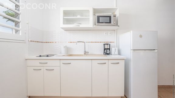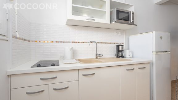 - Une cuisine ouverte équipée avec notamment : bouilloire électrique, four à micro-ondes, grille-pain, plaques de cuisson...