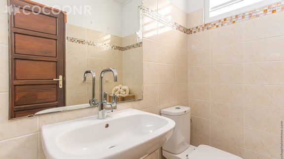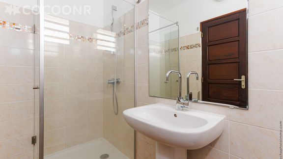 - Une salle d'eau avec douche, meuble vasque, WC