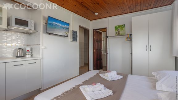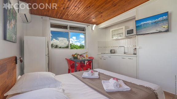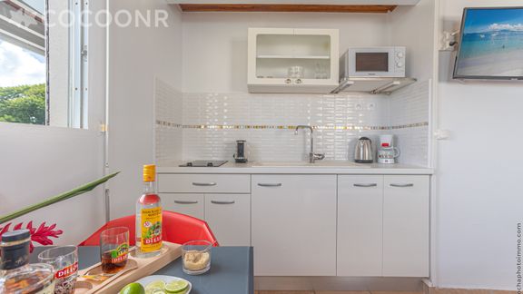 - Une cuisine ouverte équipée avec notamment : bouilloire électrique, four à micro-ondes, grille-pain, plaques de cuisson...