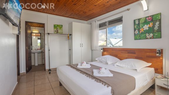 - Une pièce de vie de 20 m² avec un lit queen-size (160×200), TV, coin repas