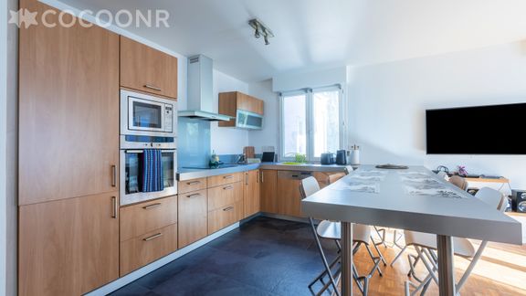 - Une cuisine ouverte équipée avec notamment : bouilloire électrique, four, four à micro-ondes, grille-pain, lave-vaisselle, plaques de cuisson, cafetière à dosettes Tassimo...