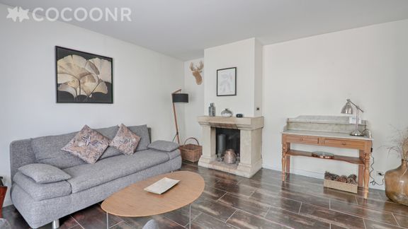 - Une pièce de vie de 50 m² avec un canapé-lit double, fauteuil, cheminée décorative, TV et accès à la terrasse