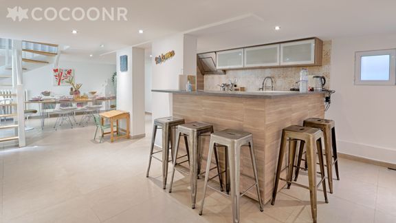 - Un espace repas avec une cuisine ouverte équipée : bouilloire électrique, four, four à micro-ondes, grille-pain, plaques de cuisson...