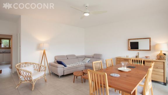 - Une pièce de vie de 30 m² avec canapé, TV, coin repas