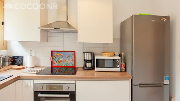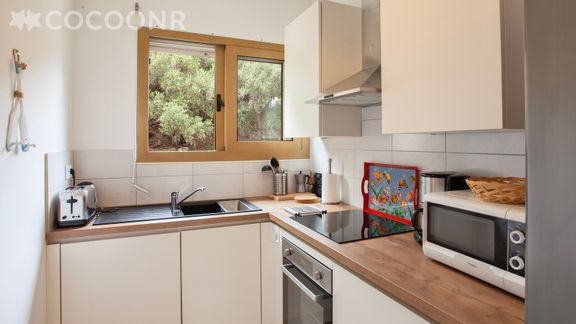 - Une cuisine équipée avec notamment : cellier, bouilloire électrique, four, four à micro-ondes, grille-pain, lave-vaisselle, plaques de cuisson...