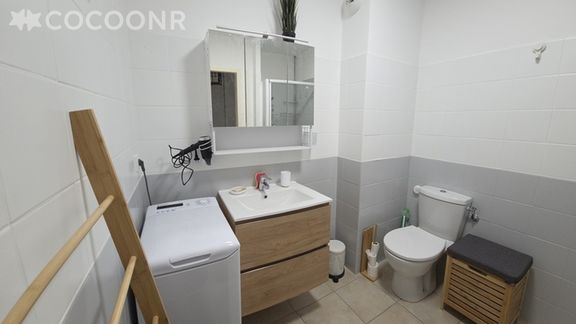 - Une salle d'eau avec douche, comprend un sèche-serviettes électrique, un meuble vasque, des étagères, des patères, et un WC.