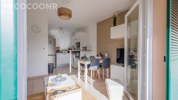 - La terrasse de 8 m², exposée sud-est, est parfaite pour se détendre. Elle est aménagée avec une table extensible (de 80 à 160 cm), quatre chaises et un parasol.