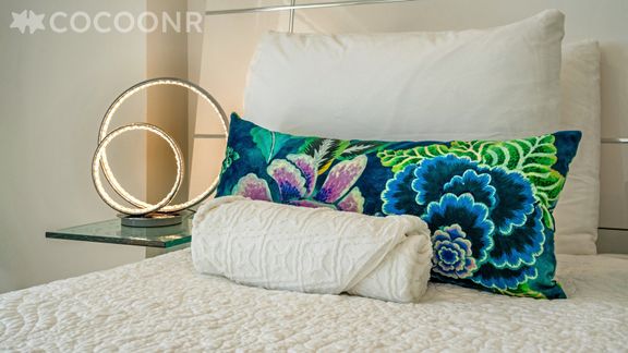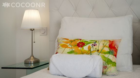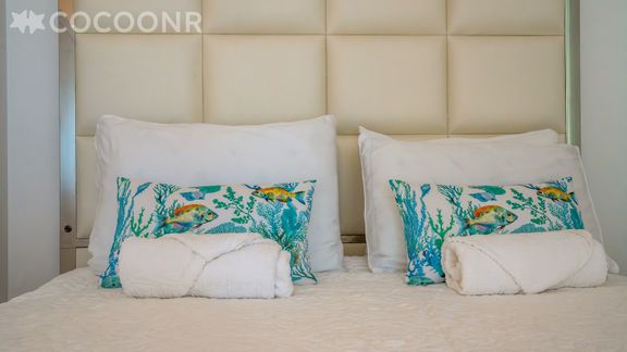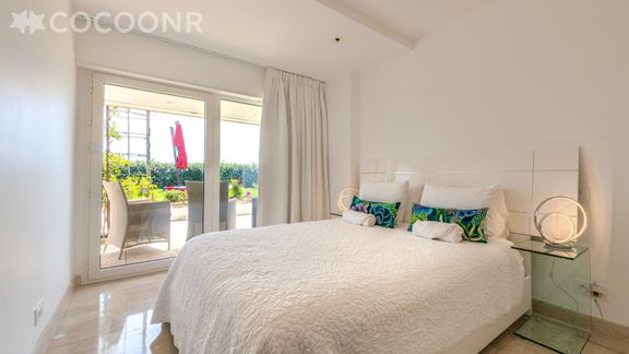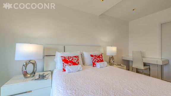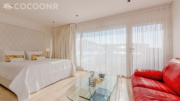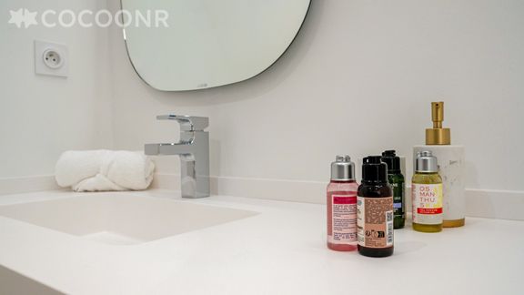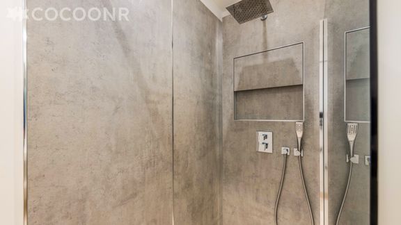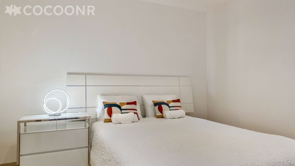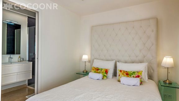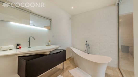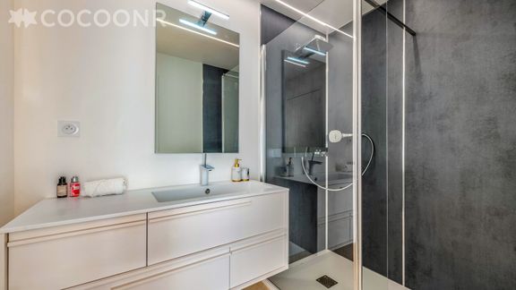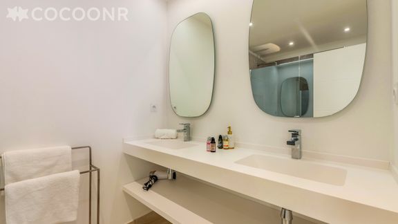 - Deux chambres avec chacune un lit king-size (180×200), penderies, partageant une salle d'eau dédiée avec douche avec WC séparé