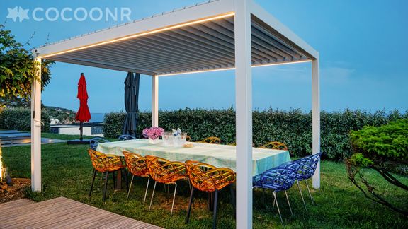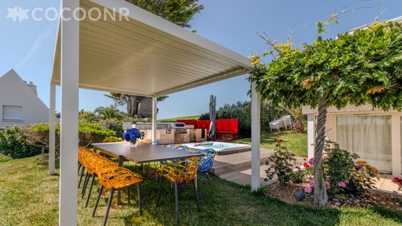 - La pergola, équipée d’un confortable salon de jardin, est l'endroit idéal pour savourer vos repas ou vous détendre à l’ombre.
