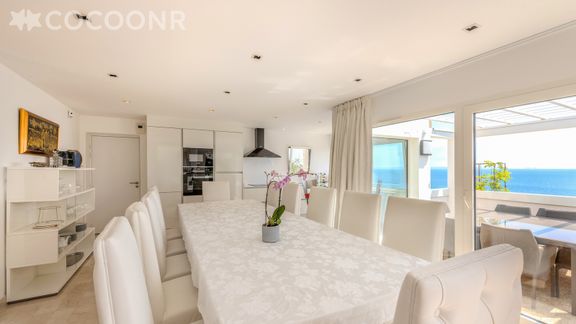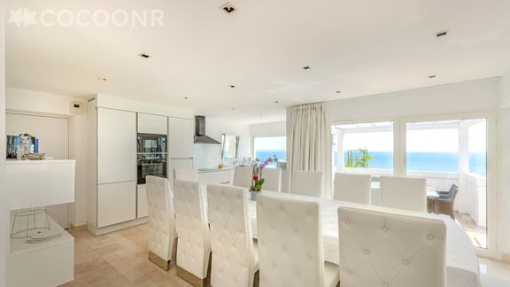 - Un espace salle à manger parfait pour se réunir autour d’un bon repas, avec une vue imprenable sur la mer depuis les baies vitrées.