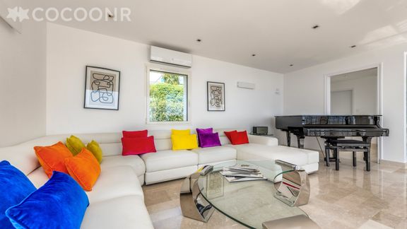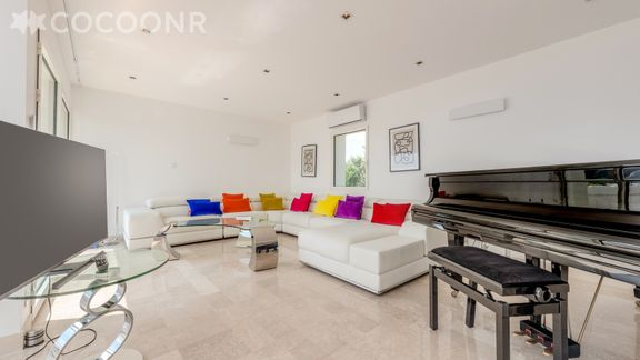 - Une pièce de vie de 60 m², équipée d’une télévision, d’un grand canapé d'angle, d'une table basse en verre, d’un piano à queue