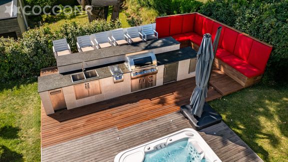 - Le jardin de 1 200 m², orienté plein sud, vous permettra de profiter du soleil tout au long de la journée. Vous pourrez également vous reposer sur les chaises longues, profiter de la douche extérieure après une belle journée à la plage, ou préparer de délicieux repas dans l'espace cuisine avec barbecue. L'éclairage automatique du jardin créera une ambiance agréable en soirée.