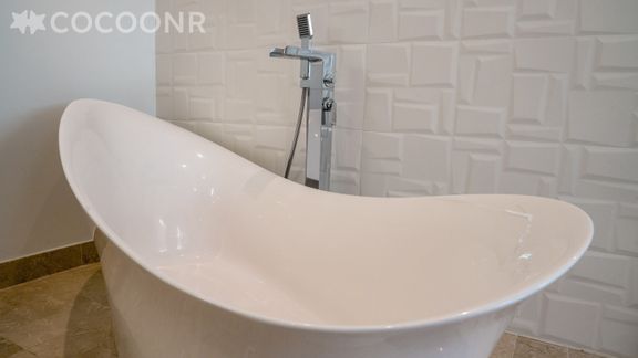 - Une suite avec un lit king-size (180×200), salle de bain attenante (baignoire), WC séparé et penderie.