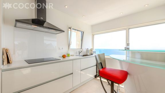 - Une cuisine ouverte équipée avec notamment : bouilloire électrique, four, four à micro-ondes, grille-pain, lave-vaisselle, plaques de cuisson… et offrant une belle vue sur la mer.