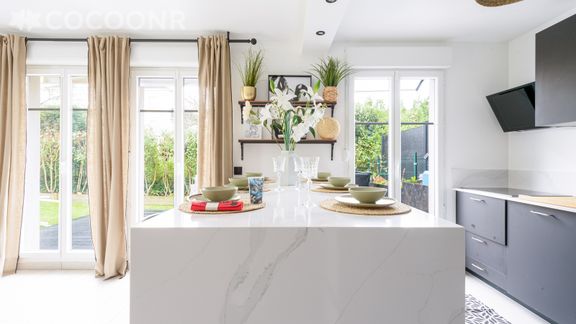 - Une cuisine équipée avec notamment : bouilloire électrique, four, four à micro-ondes, grille-pain, lave-vaisselle, plaques de cuisson... et son coin repas