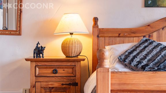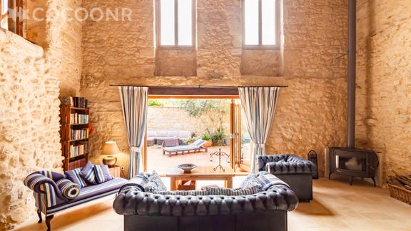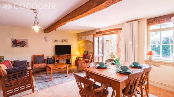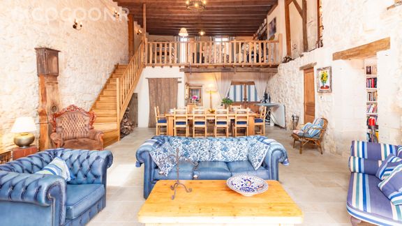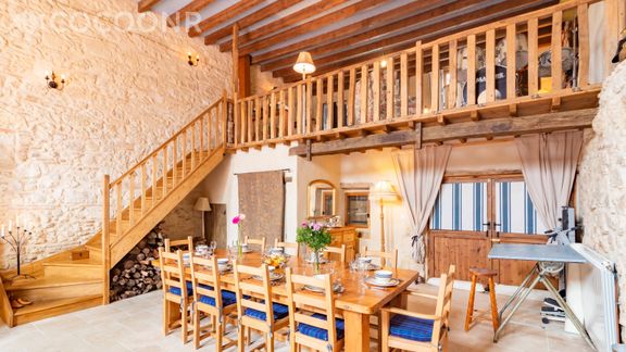 - Une pièce de vie de 60 m² avec canapé, fauteuils, coin repas et une cheminée fonctionnelle (la première flambée est fournie)