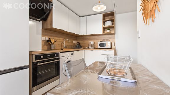 - Une cuisine équipée avec notamment : bouilloire électrique, four, four à micro-ondes, grille-pain, lave-vaisselle, plaques de cuisson...