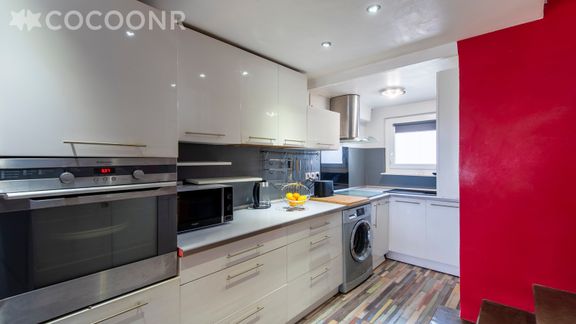 - Une cuisine ouverte équipée avec notamment : bouilloire électrique, four, four à micro-ondes, grille-pain, plaques de cuisson...
