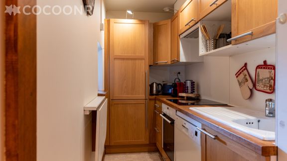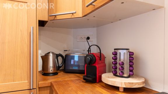 - Une cuisine équipée avec notamment : bouilloire électrique, four, four à micro-ondes, grille-pain, lave-vaisselle, plaques de cuisson...