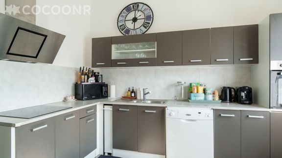 - Une cuisine équipée avec notamment : bouilloire électrique, four, four à micro-ondes, grille-pain, lave-vaisselle, plaques de cuisson... et coin repas