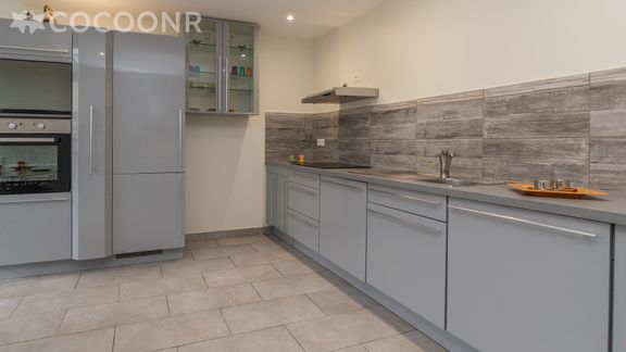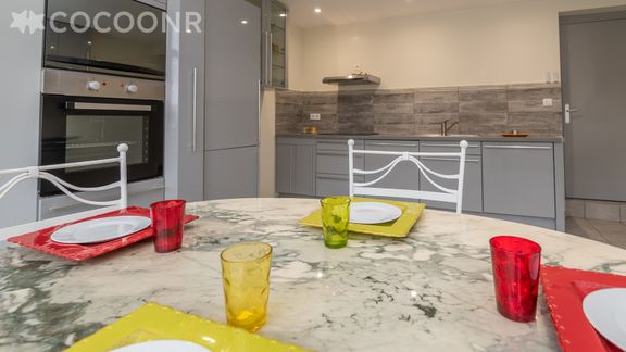 - Une cuisine équipée avec notamment : bouilloire électrique, four, four à micro-ondes, grille-pain, lave-vaisselle, plaques de cuisson...
