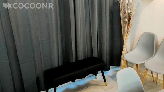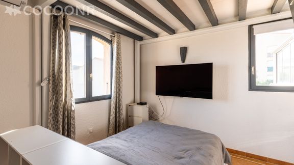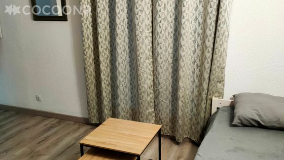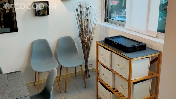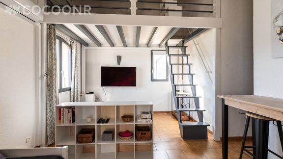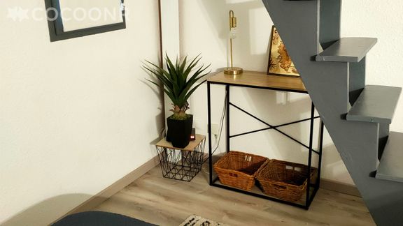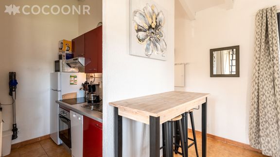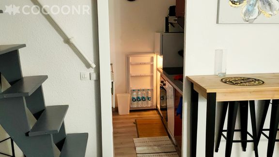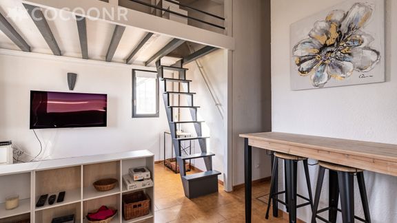 La pièce de vie se compose de plusieurs espaces : un coin salon avec une banquette convertible en lit gigogne, un espace nuit avec lit double 140 et TV, et une table haute avec tabourets de bar pour vos petits-déjeuners, pauses café ou autres.