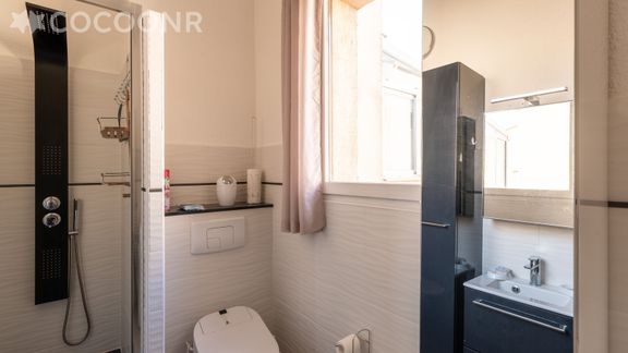 La salle de douche est équipée d'un meuble vasque, d'une colonne de rangement, de WC et d'un lave-linge.
