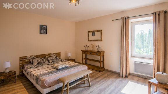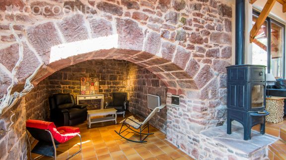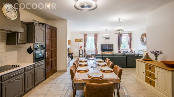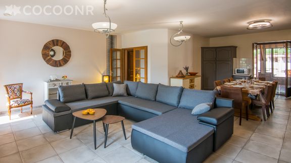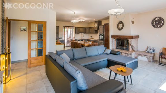 - Une pièce de vie de 55 m², avec canapé convertible, TV, cheminée...