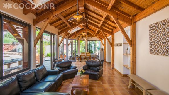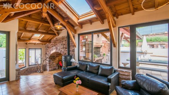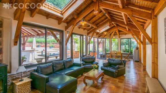 - Une véranda de 60 m² avec table et canapés, également équipée d’un poêle à bois