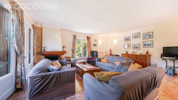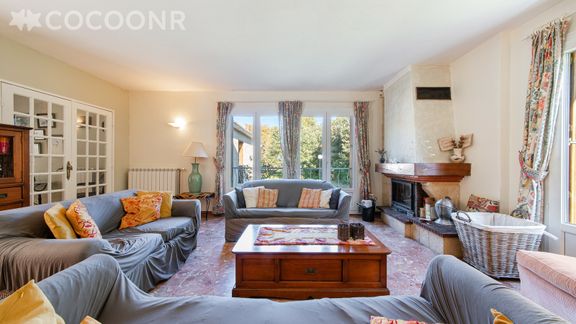 - Une pièce de vie de 43 m² avec canapés, TV, cheminée (bois fourni)