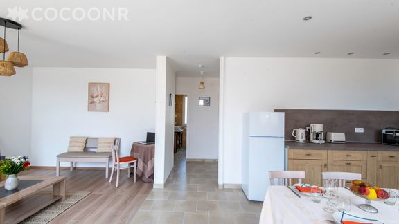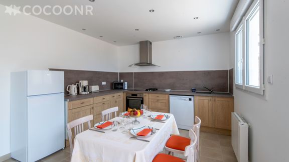 - Une cuisine ouverte équipée avec notamment : bouilloire électrique, four, four à micro-ondes, grille-pain, lave-vaisselle, plaques de cuisson...