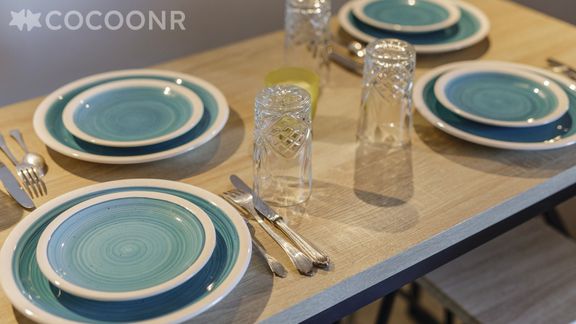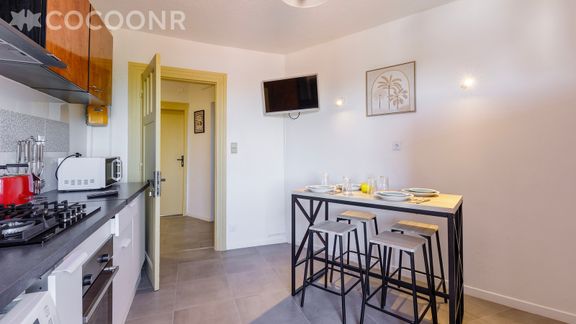 - Une cuisine équipée avec notamment : bouilloire électrique, four, four à micro-ondes, grille-pain, plaques de cuisson et son coin repas